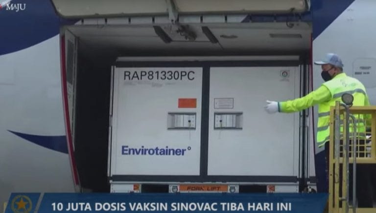 Sebanyak 10 juta dosis vaksin Covid-19 produksi Sinovac dalam bentuk bahan baku atau bulk, Minggu, 20 Juni 2021 siang, tiba di Bandar Udara Soekarno-Hatta, Tangerang, Banten.