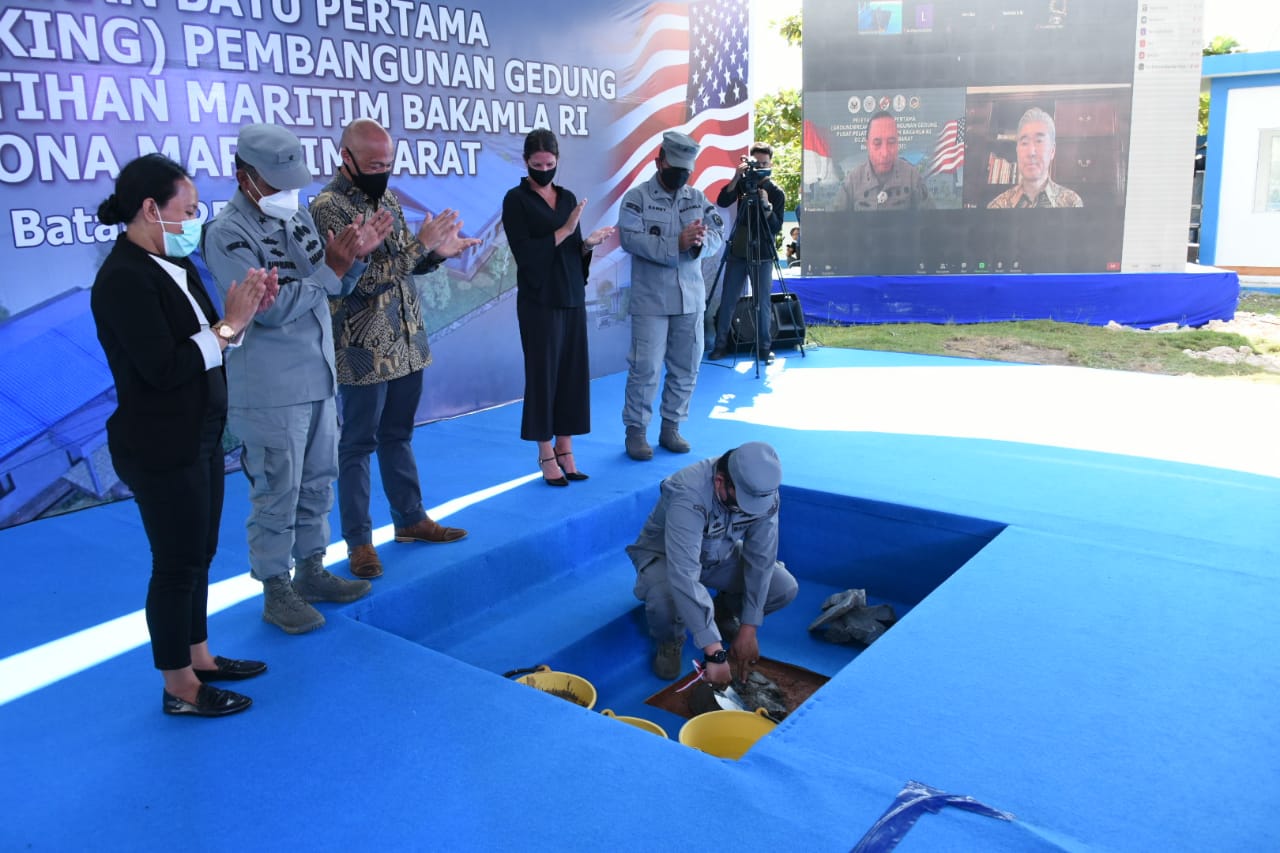 Duta Besar AS Sung Kim dan Kepala Bakamla RI Laksdya TNI Aan Kurnia yang diwakili oleh Deputi Kebijakan dan Strategi Bakamla RI Laksda Bakamla Tatit E. Witjaksono (Han) memimpin Upacara Peletakan Batu Pertama Pusat Pelatihan Maritim Badan Keamanan Laut Republik Indonesia (Bakamla RI) di Pangkalan Armada Batam, Jl. Jembatan 2 Balerang, Jumat, 25 Juni 2021.