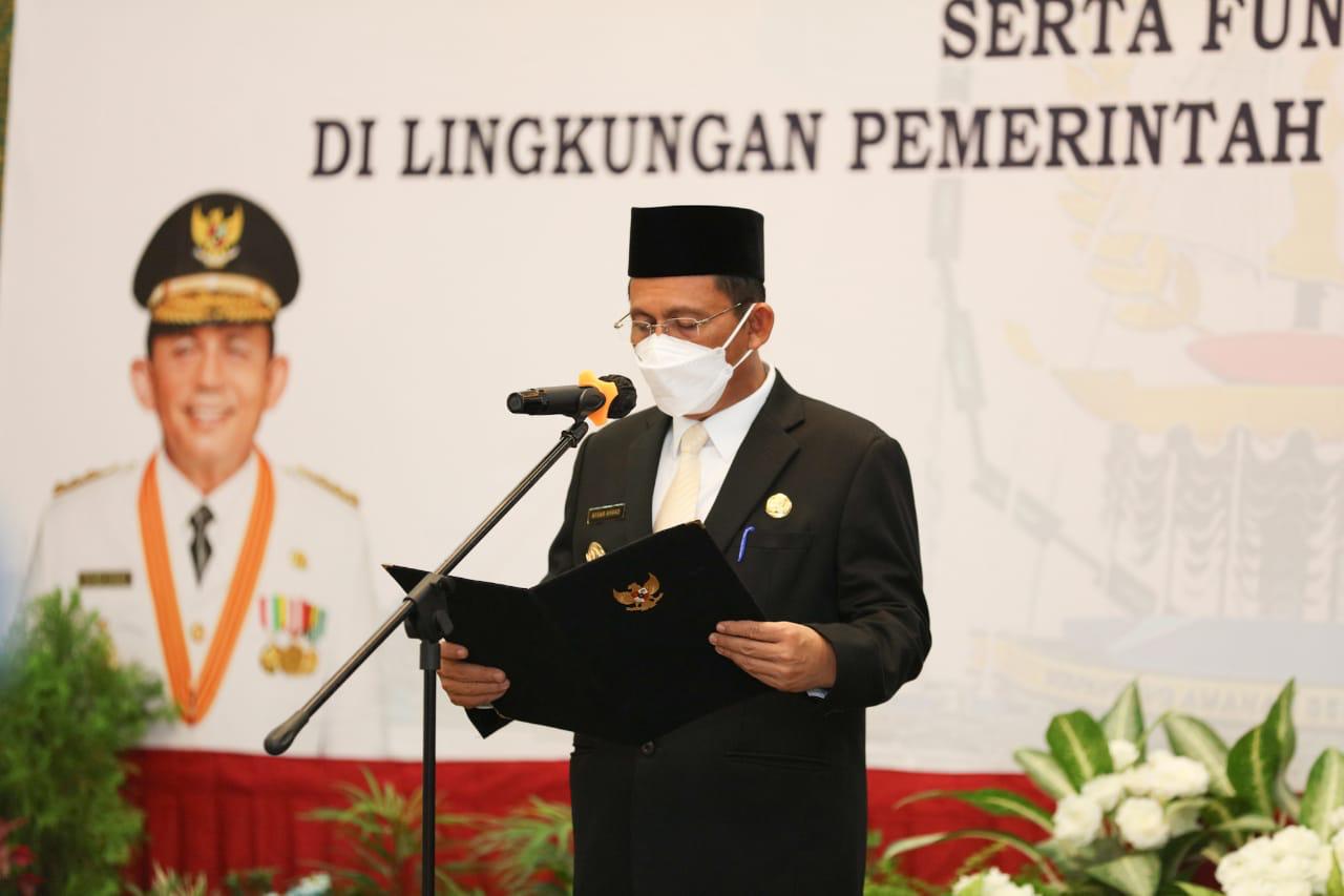 Gubernur Kepulauan Riau, Ansar Ahmad mengambil sumpah dan melantik pegawai negeri sipil (PNS) untuk jabatan administrator, pengawas, dan fungsional di lingkungan Pemerintah Provinsi Kepri, Kamis, 14 Oktober 2021 di Gedung Daerah Tanjungpinang.