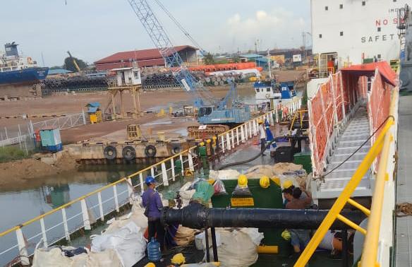 Para pekerja saat mengemas limbah dari MT Bitumen Eiko. (Foto: Arsip narasumber)
