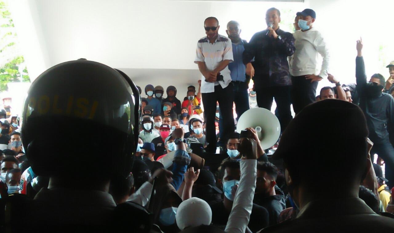 Usai berorasi di depan Polsek Batam Kota, ratusan massa pun berpindah ke depan Kantor DPRD Kota Batam. Dengan mendapat pengawalan ketat polisi, aksi pun berjalan damai setelah Anggota Komisi II DPRD Kota Batam, Putra Yustisi Respati, menjumpai massa aksi.