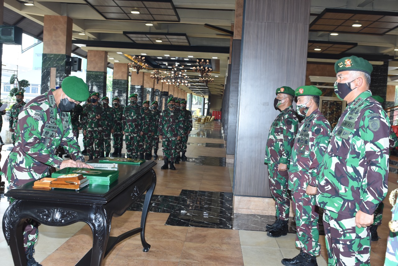 Kepala Staf Angkatan Darat (Kasad) Jenderal TNI Andika Perkasa memimpin Serah Terima Jabatan (Sertijab) Pangkostrad dan lima pejabat teras lainnya di jajaran TNI AD. Acara yang digelar dengan ketat dan tetap menerapkan Protokol Kesehatan 3M berlangsung hikmat di Lantai Dasar Gedung E Markas Besar Angkatan Darat (Mabesad), Jakarta, Selasa, 8 Juni 2021.