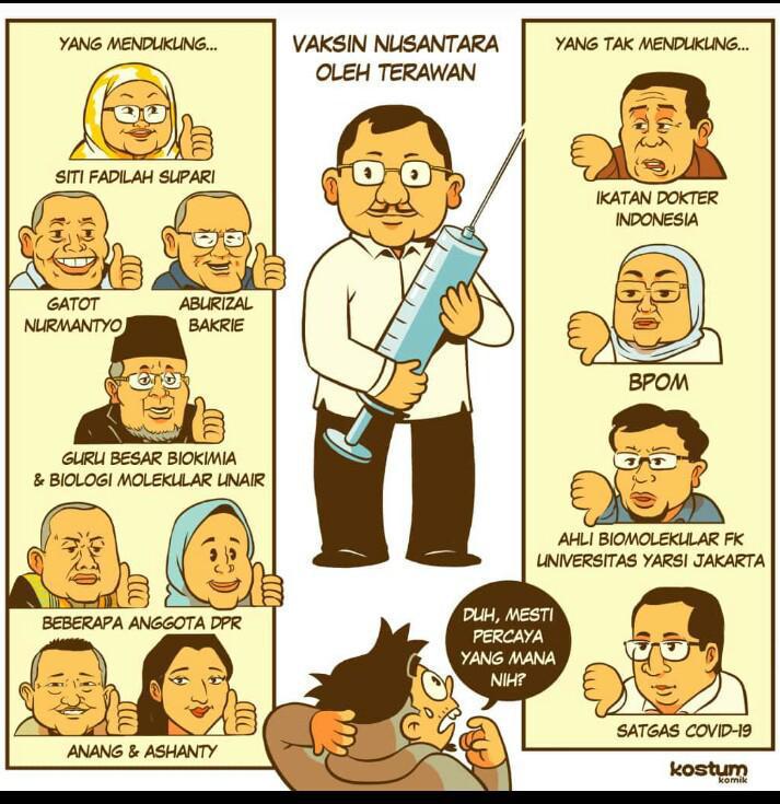 Jadi sebaiknya riset dan pengembangan semua vaksin bisa diteruskan. Bila perlu Badan POM yang memiliki tim pakar ikut membantu dan mengawasi langsung. “Sebab pada akhirnya semua produk obat dan makanan termasuk vaksin, harus mendapat ijin edar dari Badan POM,” kata mantan Menteri Koordinator Bidang Kesejahteraan Rakyat (Menko Kesra).