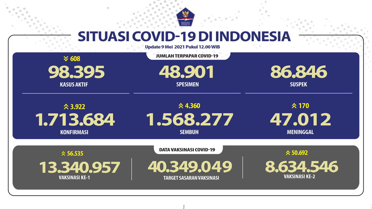 Data dari Badan Nasional Penanggulangan Bencana (BNPB), di Jakarta, Minggu, 09 Mei 2021 juga mencatat, kasus aktif berkurang 608 kasus, jumlah menjadi 98.395 kasus.