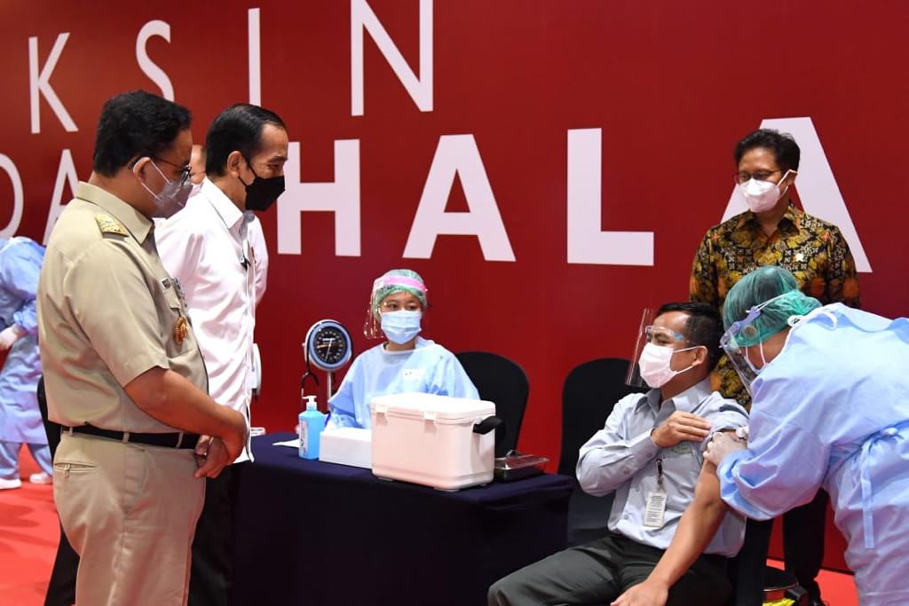 Presiden Joko Widodo, Senin, 3 Mei 2021, meninjau langsung pelaksanaan vaksinasi massal di dua pusat perdagangan di Jakarta. Vaksinasi tersebut diperuntukkan bagi para pelaku usaha/perdagangan yang dalam kesehariannya berinteraksi langsung dengan publik atau pelanggan.