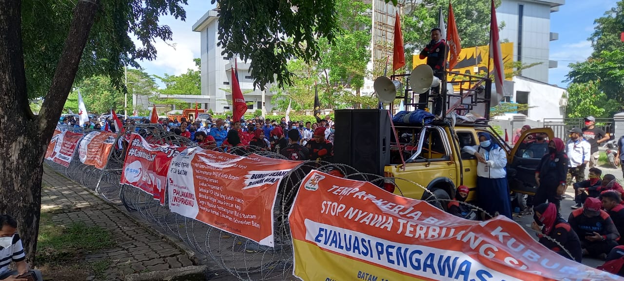 Ratusan buruh gabungan berbagai serikat pekerja menggelar demo di depan Kantor Graha Kepri, Batam, Kepulauan Riau, Kamis, 25 November 2021. Demo dilakukan sebagai bentuk penolakan terhadap penetapan upah minimum kota (UMK) yang ditetapkan Pemerintah Provinsi Kepulauan Riau yang dinilai terlalu kecil.