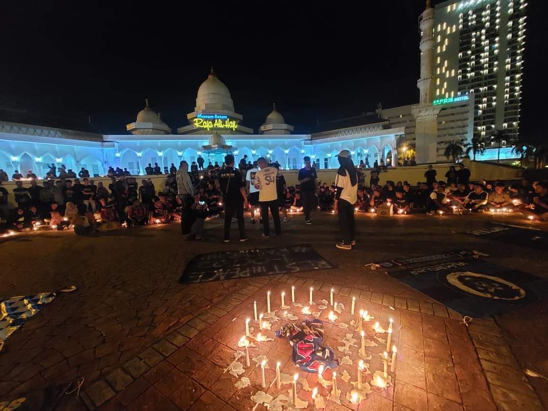 BATAM – Aksi seribu lilin sebagai bentuk solidaritas tragedi Kanjuruhan, Malang, Jawa Timur diadakan seluruh aliansi suporter sepak bola di Alun-Alun Kota Batam, Kepulauan Riau (Kepri), Ahad, 2 Oktober 2022, malam.