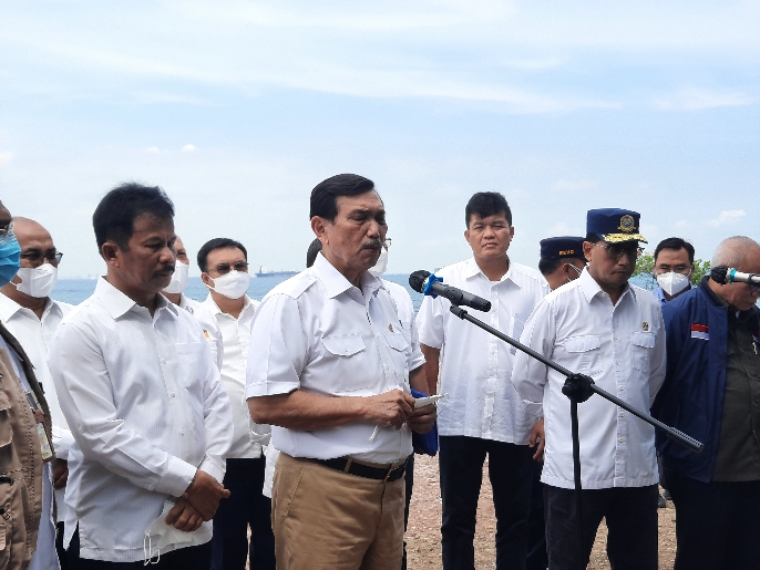 Menteri Koordinator Bidang Kemaritiman dan Investasi, Luhut Binsar Panjaitan, bersama Menteri Perhubungan, Budi Karya Sumadi, meninjau lokasi rencananya pembangun pelabuhan baru di Tanjung Pinggir, Sekupang, Batam, Kepulauan Riau, pada Senin, 24 Januari 2022.