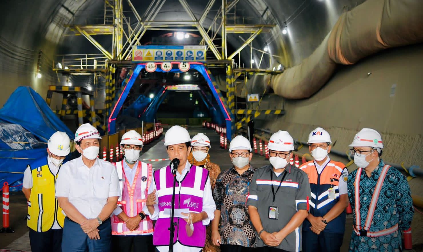 Presiden Joko Widodo melakukan peninjauan langsung perkembangan konstruksi Terowongan (tunnel)-Dua, Kereta Cepat Jakarta-Bandung (KCJB) di wilayah Kabupaten Purwakarta, Provinsi Jawa Barat, Senin, 17 Januari 2022. Pembangunan prasarana perhubungan tersebut alami kendala sejumlah masalah teknis terkait kondisi tanah.