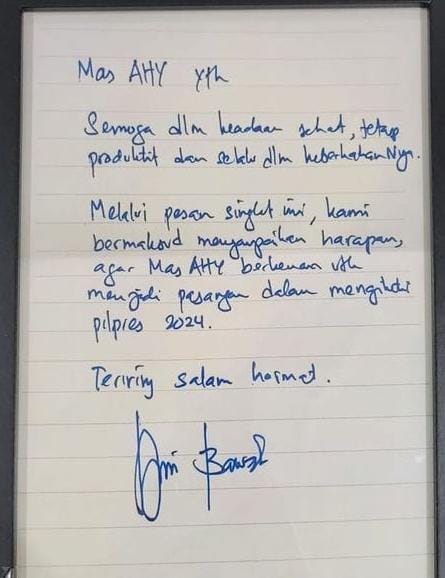 Sepucuk surat tulisan tangan yang menyebutkan AHY diharapkan menjadi pasangan Anis pun viral di media. ” Melalui pesan singkat ini, kami bermaksud menyampaikan harapan, agar Mas AHY berkenan utk menjadi pasangan dalam mengikuti Pilpres 2024. ” Salah satu kalimat dalam surat yang ditandatangani mirip tulisan Anis.