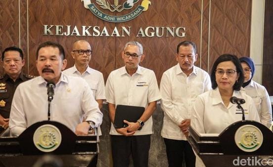 Jaksa Agung Burhanuddin (kiri) dan Menkeu Sri Muyani saat jumpa pers tentang dugaan korupsi Rp2,5 Triliun. (Foto: Ist/detik.com).
