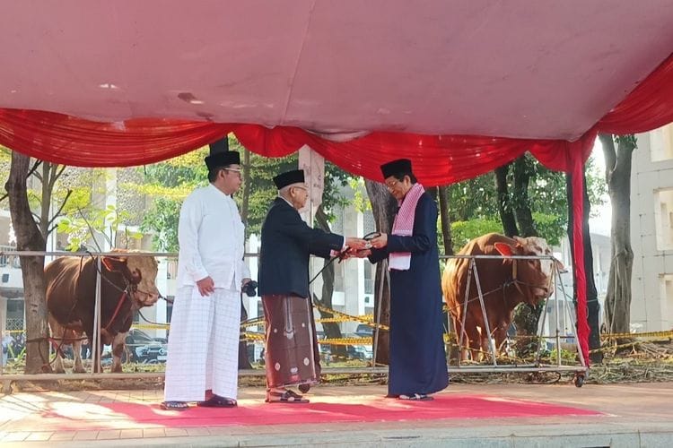 JAKARTA – Wakil Presiden (Wapres) Ma’ruf Amin menyerahkan seekor sapi hewan kurban ke pihak Masjid Istiqlal Jakarta. Sapi jenis limosin dengan bobot sekitar 1,2 ton itu diserahkan langsung Senin, 17 Juni 2024. Pada kesempatan itu juga, Wapres menyerahkan seekor sapi milik Presiden Joko Widodo. Pada Idul Adha kali ini, Presiden Jokowi melaksanakan sholat Idul Adha di Masjid Agung Kota Semarang, Jawa Tengah.
