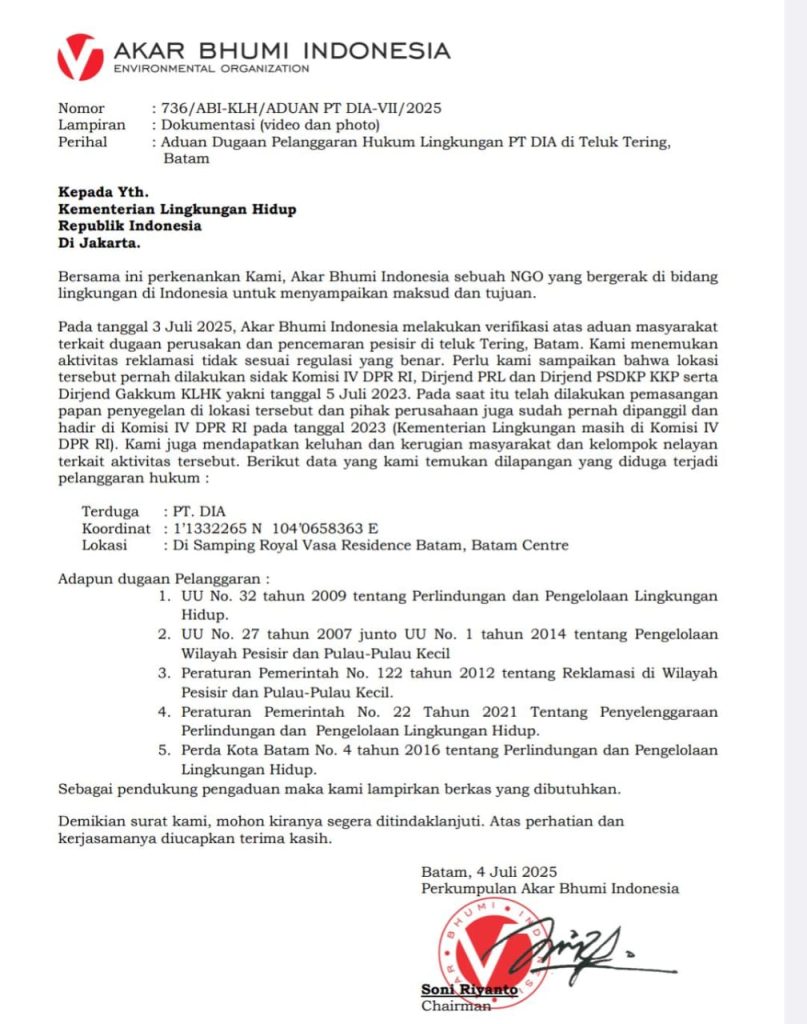 BATAM – NGO Akar Bhumi Indonesia secara resmi melaporkan dugaan pelanggaran hukum lingkungan yang dilakukan oleh PT DIA di wilayah pesisir Teluk Tering, Kota Batam, Kepulauan Riau. Laporan tersebut telah disampaikan kepada Kementerian Lingkungan Hidup Republik Indonesia, disertai bukti dokumentasi berupa foto dan video.