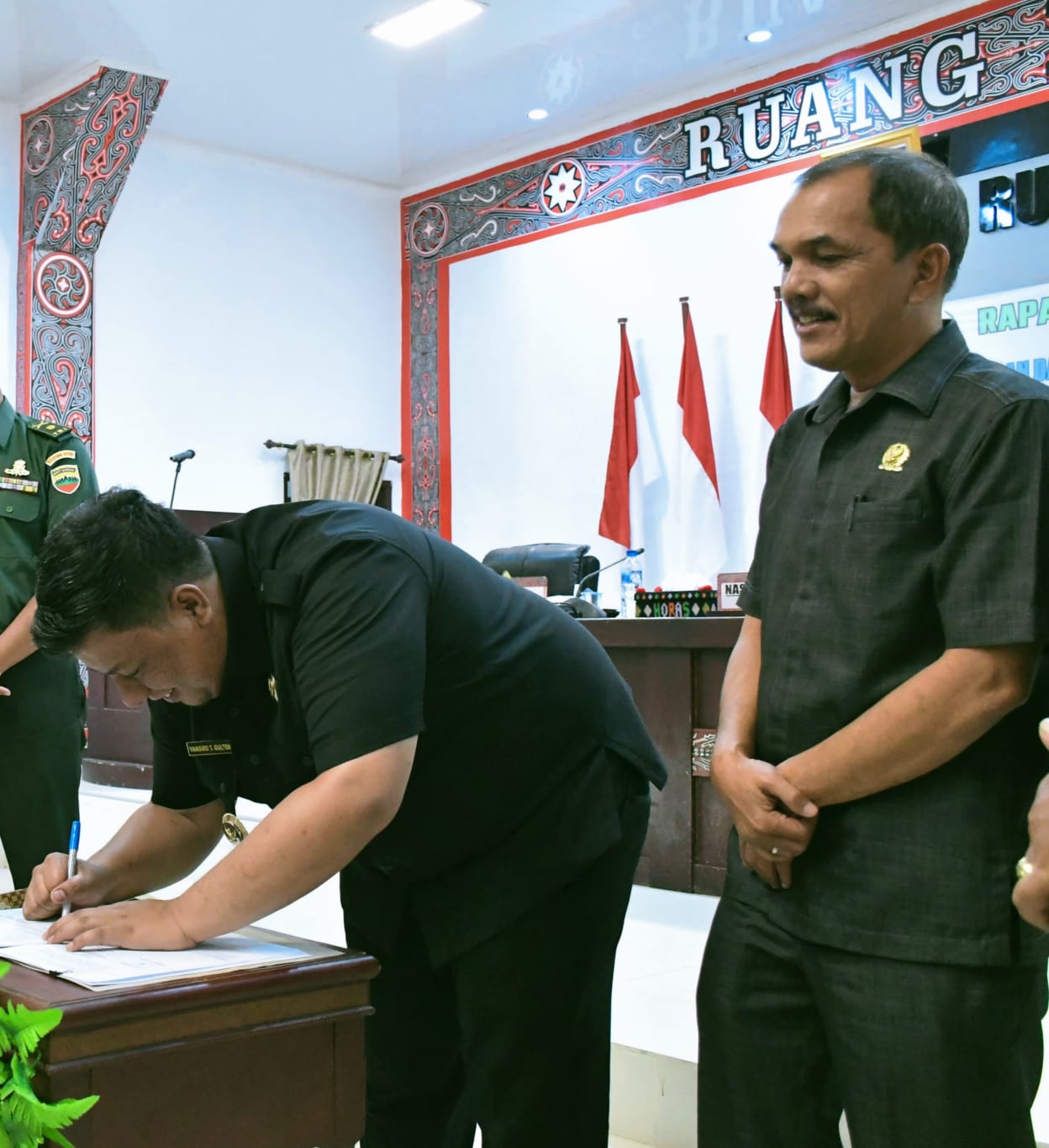 Bupati Samosir Vandiko Timotius Gultom bersama Ketua DPRD Nasip Simbolon saat penanda tanganan Persetujuan Ranperda Menjadi Perda Di Kantor DPRD Kabupaten Samosir. (Foto: Kominfo Samosir).