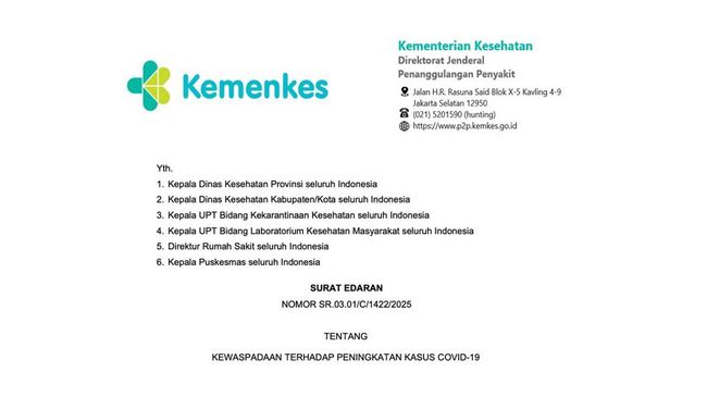 JAKARTA – Kementerian Kesehatan (Kemenkes) menerbitkan Surat Edaran (SE) Nomor SR.03.01/C/1422/2025 tentang Kewaspadaan Terhadap Peningkatan Kasus Covid-19. Surat ditandatangani Plt. Dirjen Penanggulangan Penyakit Kemenkes Murti Utami pada 23 Mei 2025 dan dipublikasikan di situs resmi Kemenkes pada tanggal 28 Mei 2025.