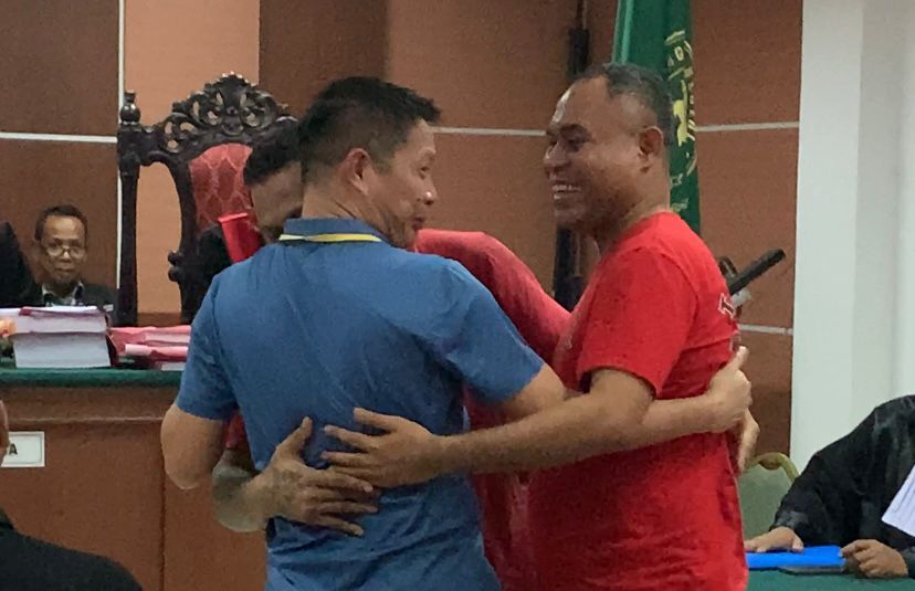 Terdakwa Johanes Ndona Woda dan Bonafasius Lamapaha berpelukan dengan korban Ferdy di muka persidangan Pengadilan Negeri Batam, Kamis, 19 Juni 2025. (Foto: HMStimes./ Flavia Donella Bangun).