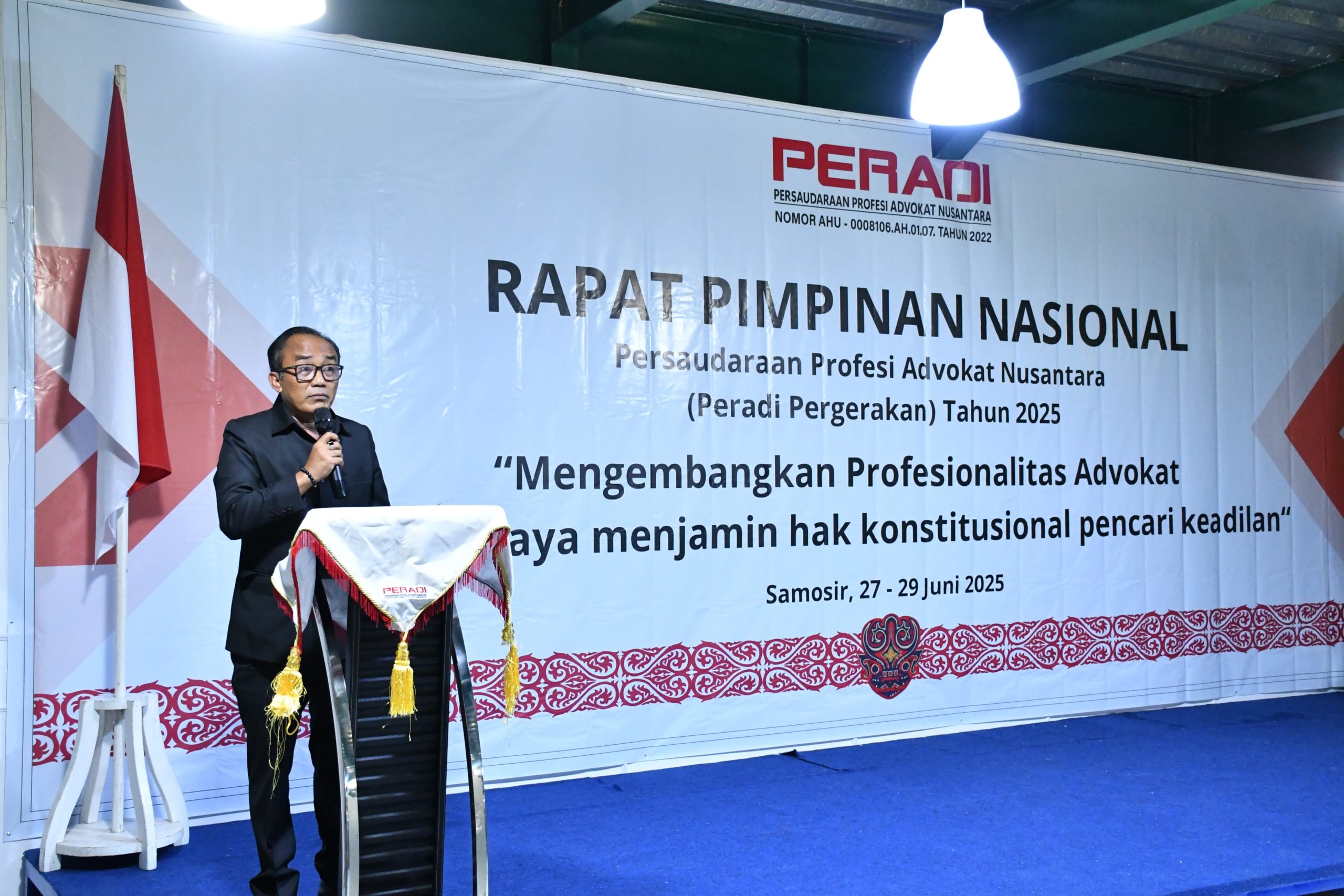 Ketua Umum Peradi Hermawi Fransiskus Taslim mengucapkan terima kasih atas penyambutan dan kesediaan Pemkab Samosir menjadi tuan rumah. Ia mengakui bahwa Samosir saat ini mengalami kemajuan yang pesat, yang ditandai dengan kemacetan yang ada di beberapa titik.
