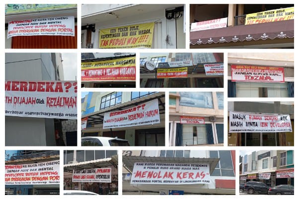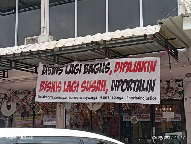 Spanduk itu memuat kalimat protes keras, di antaranya “Masuk rumah sendiri kok masih minta izin developer” dan “Bisnis lagi bagus dipalakin, bisnis lagi susah diportalin.” Tulisan tersebut mencerminkan kekesalan warga terhadap kebijakan pengembang PT Menorah Propertindo.