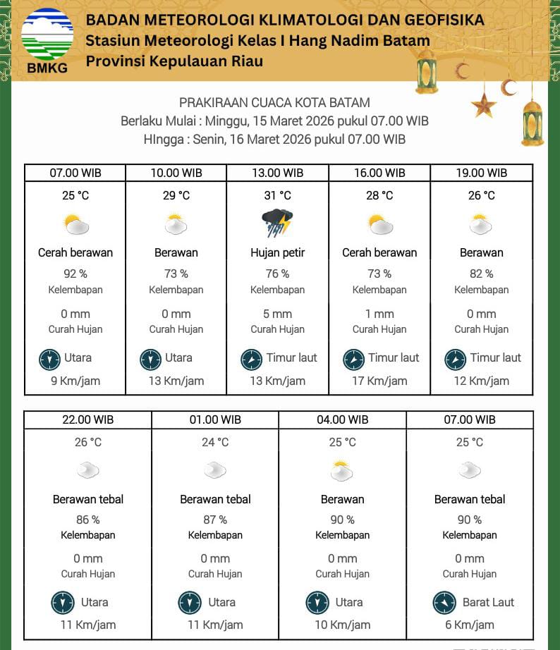Berdasarkan prakiraan cuaca yang berlaku mulai Pukul 07.00 WIB hingga Senin, 16 Maret 2026 Pukul 07.00 WIB, suhu udara di Batam diperkirakan berada pada kisaran 24 hingga 31 derajat Celcius dengan tingkat kelembapan relatif tinggi, yakni antara 73 hingga 92 persen.