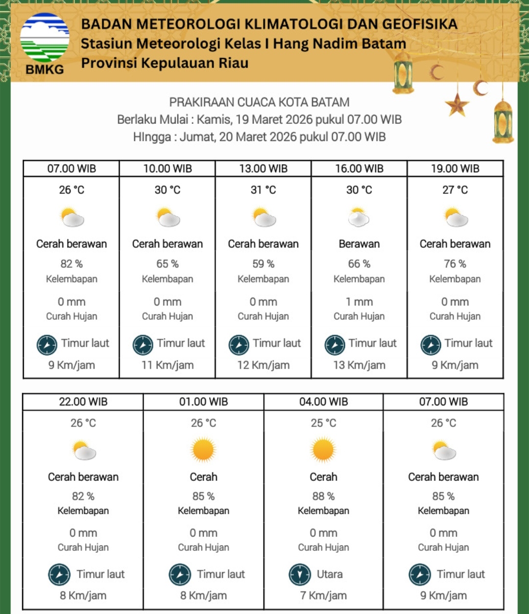 Batam, HMS Times – Badan Meteorologi, Klimatologi, dan Geofisika (BMKG) Stasiun Meteorologi Kelas I Hang Nadim Batam memprakirakan cuaca di Kota Batam pada Kamis (19/3/2026) didominasi kondisi cerah berawan. Meski demikian, hujan dengan intensitas ringan berpotensi terjadi pada sore hari.