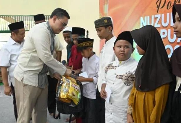 Ketua Umum PPK Kosgoro 1957 Dave Akbarshah Fikarno Laksono menyerahkan paket bantuan pada anak yatim di sela peringatan Nuzulul Qur’an di Masjid Raya Al Hurriyyah, Puri Kembangan, Jakarta Barat, Sabtu, 14 Maret 2026. (Foto: Ist./Kosgoro 1957).