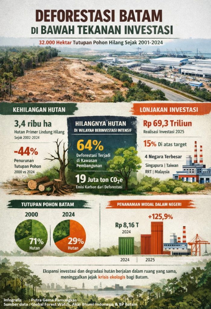 Jika seluruh data ini dibaca secara bersamaan, terlihat satu pola utama, yakni deforestasi di Batam terjadi karena kombinasi tekanan ekonomi, perubahan kebijakan tata ruang, ekspansi investasi, serta lemahnya pengendalian pemanfaatan lahan.