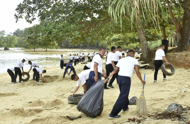 Hadir dalam aksi bersih-bersih pantai, Kapoksahli Kodaeral IV, seluruh Pejabat Utama (PJU) dan Kepala Satuan Kerja (Kasatker) Kodaeral IV.